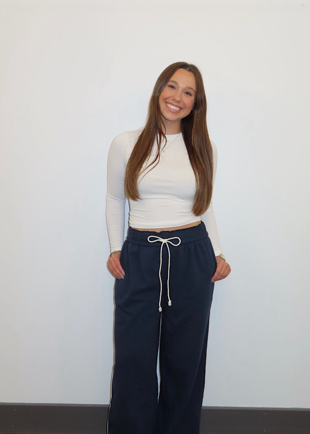 These mid rise sweatpants feature a chic white stripe down the side for a sporty, on-trend vibe. The permanently folded-down waistband adds a unique, laid-back touch, complete with drawstrings that tie into a cute bow for added style. And of course they have pockets! Perfect for lounging at home or running errands, these sweatpants combine comfort and style effortlessly.